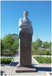 Сипаттамасы: Мүсін күрті гранитінен жасалып, монолитті блоктардан құралған тұғырға орнатылған. Мүсіннің биіктігі 1,70 м. Жалпы биіктігі 4 м. Мүсіннің авторы – Амангелді Кененбаев. Ескерткіштің тұғырына QR-код тақтайша орнатылған.